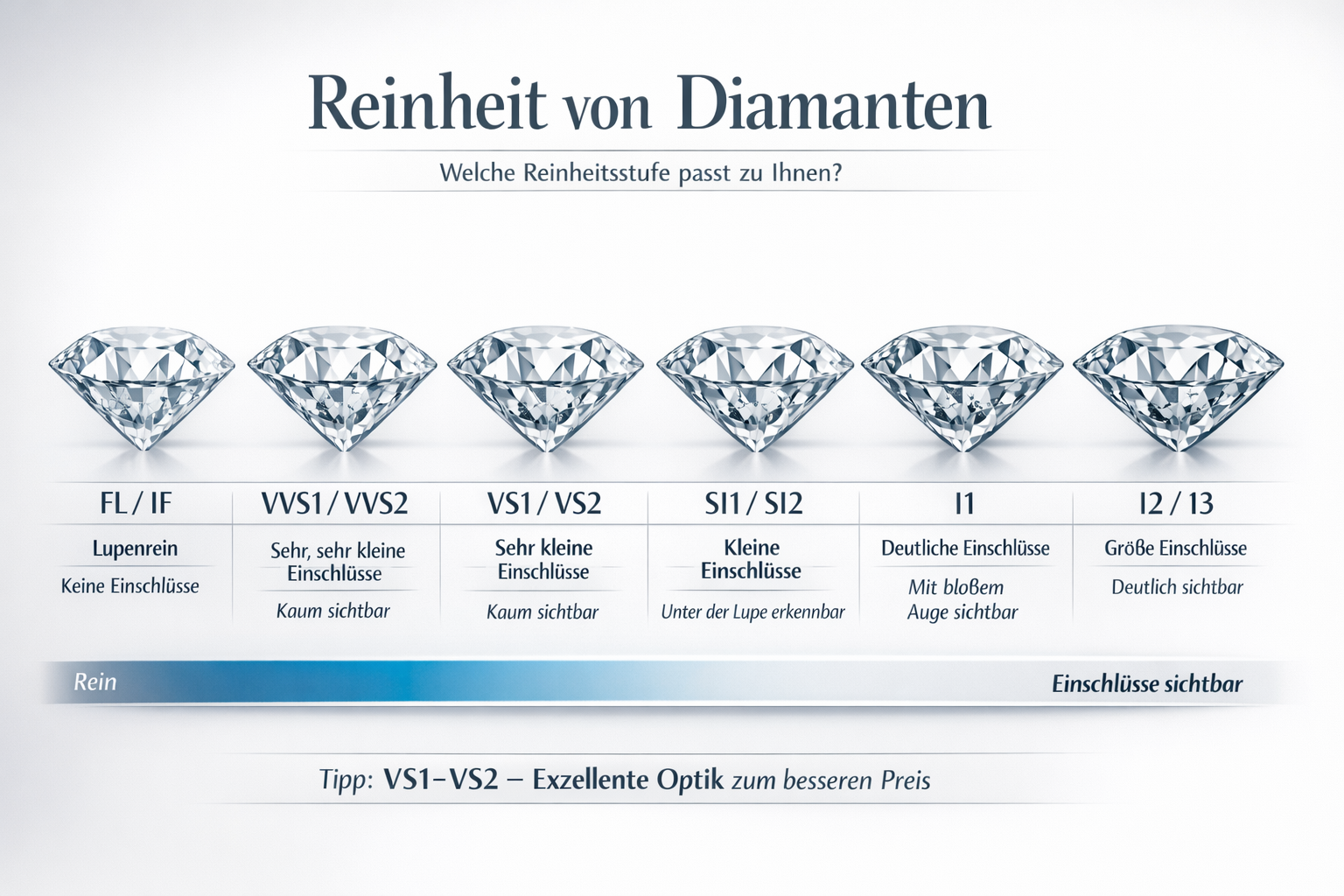 Die Reinheit beschreibt Anzahl und Sichtbarkeit natürlicher Einschlüsse – je reiner der Diamant, desto wertvoller.