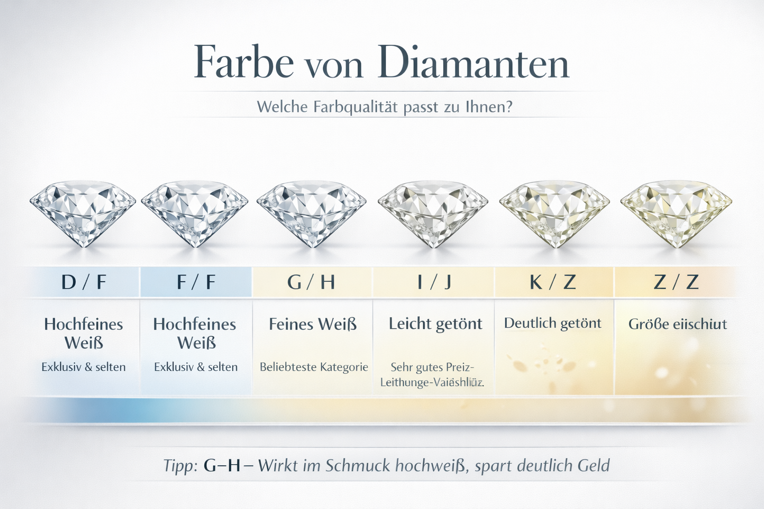 Die Farbe bestimmt den Weißgrad des Diamanten: Je farbloser er ist, desto seltener und wertvoller.